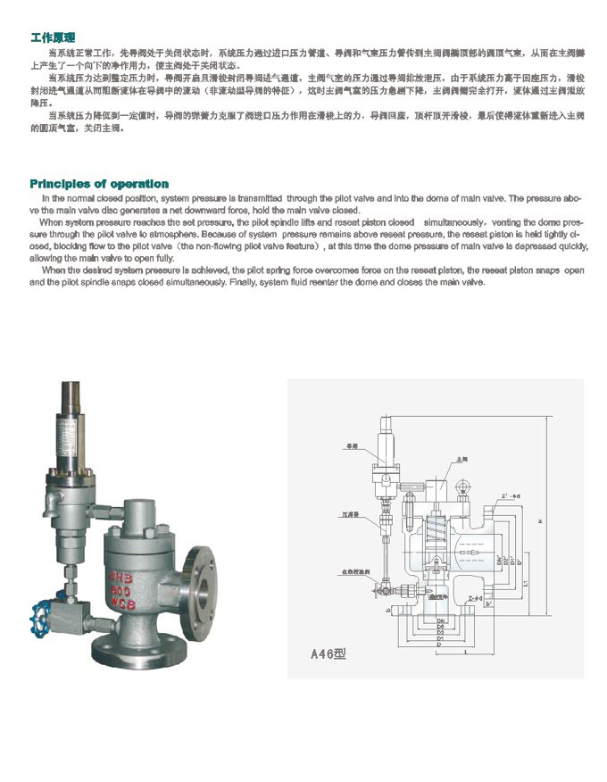 當(dāng)系統(tǒng)壓力達(dá)到整定壓力時(shí),導(dǎo)閥開啟且滑梭封閉導(dǎo)門進(jìn)氣通道.主閥氣室 的壓力通過(guò)導(dǎo)閥排放泄壓,由于系統(tǒng)壓力高于回座壓力.滑梭封閉進(jìn)氣通道從而阻斷流體在導(dǎo)閥中的流動(dòng)(非流動(dòng)型導(dǎo)閥的特征).這時(shí)主閥氣室的壓力急劇下降,主閥閥瓣完全打開.流體通過(guò)主閥泄放降壓。當(dāng)系統(tǒng)壓力降低到一定值時(shí).導(dǎo)閥的彈簧力克服了閥進(jìn)口壓力作用在滑梭上的力,導(dǎo)閥回座.頂桿頂開滑梭,Zui后使得流體重新進(jìn)入主閥的圓通氣室,關(guān)閉主閥.