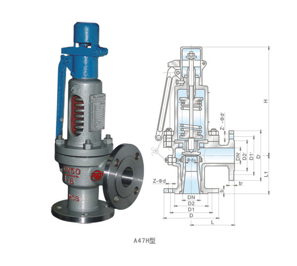 A47H型適于溫度《350℃的蒸汽、空氣、水等介質的設備和管路上。當設備和管路內壓力超過允許值時,閥門自動開啟,繼而全量排放:當壓力降低到規定值時,閥門自動關閉,保證設備和管路的安全運行。