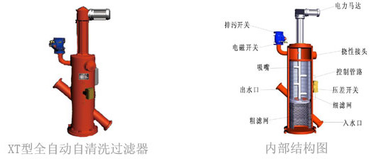1、XT型全自動自清洗過濾器由驅動馬達、執行機構、電控器、控制管路、過濾體、粗濾芯、細濾芯、進出口連接法蘭等主要零部件組成。